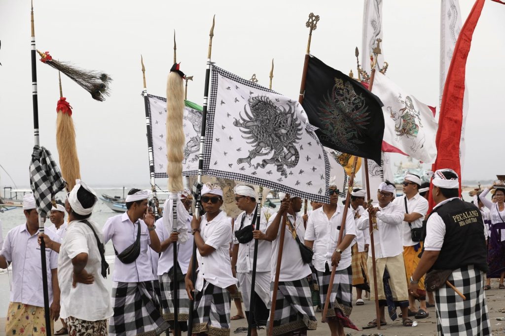 The ceremonies begin a few days before, marked by the purification ritual Melasti. During this ceremony, sacred objects and temple offerings are carried in procession from the temples to the sea, rivers or other sources of water to be purified. Dressed in white, they gather along the shoreline with the intention of cleansing themselves of impurities into the ocean. In Balinese Hindu belief, the sea is regarded as tirta amerta — the water of life.